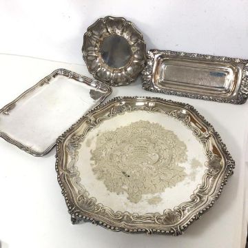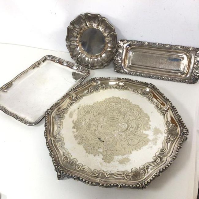 An Epns footed salver inscribed Presented to Mr D. Carmichael by the Iron Shipbuilders of Castle Building Yard, 30th May 1871 (32cm) and an Epns pen tray, envelope tray and a floral dish with cross keys stamped to base and initials WK (4)