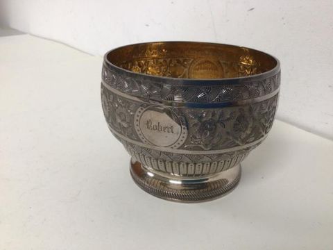 A Victorian London silver footed bowl inscribed Robert from Godfather and Godmother, Henry and Annie Dickie 1882 (190.99g)