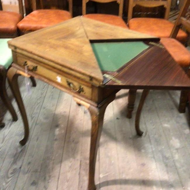 A Victorian walnut envelope foldover card table with baize lined interior, fitted single drawer on carved moulded supports and pad feet (70cm x 55cm x 55cm)