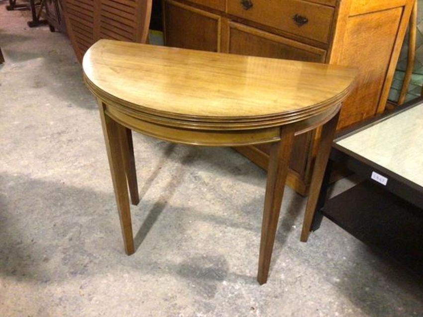 An Edwardian mahogany demi lune foldover tea table, the faded top with fluted edge, on square tapered supports and plain frieze (71cm x 84cm x 43cm)
