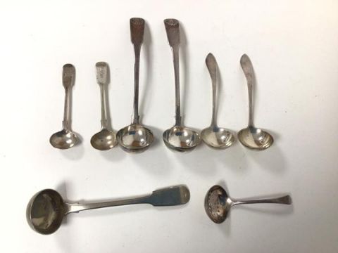 A pair of early 19thc Edinburgh silver ladles, each with shells and initials to stem and two Glasgow silver ladles and two small London silver spoons (combined: 150.63g) and two other Epns ladles