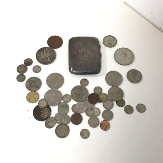 An Edwardian Birmingham silver engine turned cigarette case (61.07g) and a collection of coins including a Victorian silver crown, thrupences etc.