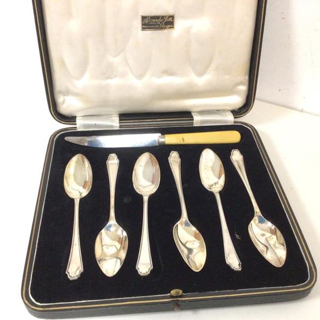 A set of six Sheffield silver grapefruit spoons (combined: 143.48g) and a possibly unassociated grapefruit knife in an Alexander Scott, Glasgow box