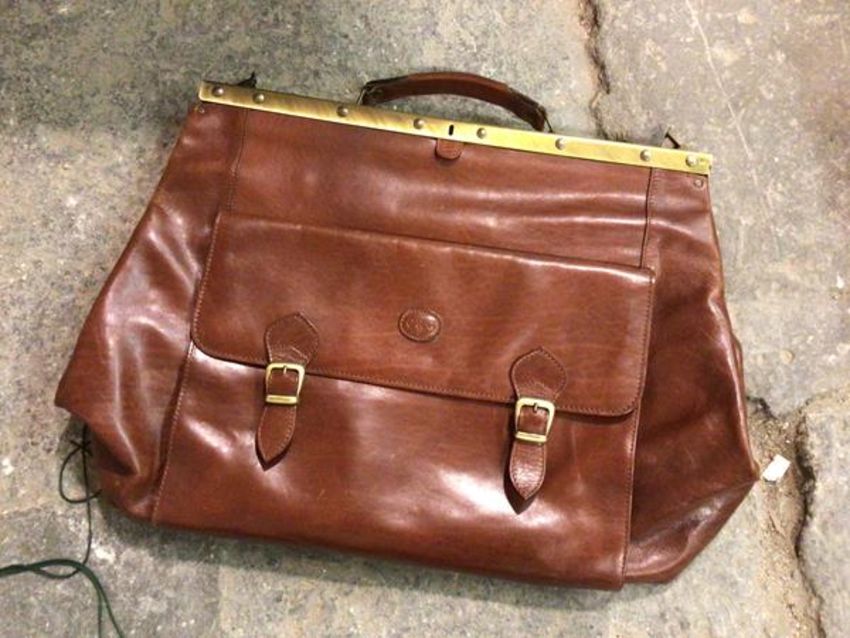 A leather bag with brass clasp, with a Paulo Del Curia Firenze label and Scuola del Cuoio to interior, monogram C.R.G to exterior (45cm x 60cm x 30cm)