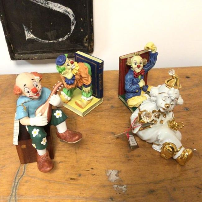 A Capodimonte figure of a Clown Seated, the Italian label describes Limoges and Swarofski (17cm) A Goebels Conny figure of a Clown playing a Strung instrument and two clown bookends (a lot)