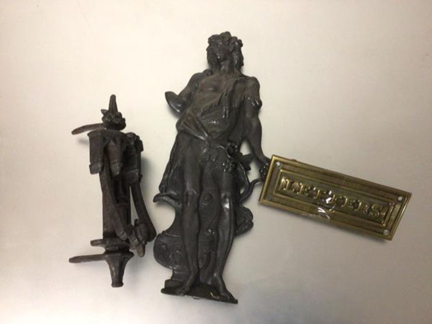 A spelter cast Standing Figure, after David (32cm), a brass letter box and a Victorian cast iron gothic door knocker (21cm x 8cm)