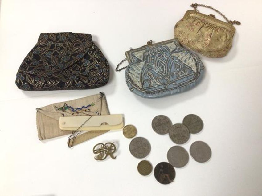 A mixed lot including three purses, six c.1950 half crowns, an 1896 penny etc. (a lot)