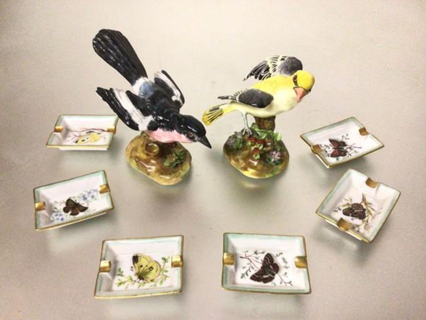 A Crown Staffordshire model of a Songbird mounted on naturalistic base, painted in polychrome enamels and another, Songbird (15cm and 13cm), and a set of six Limoges Butterfly handpainted miniature table ashtrays (a lot)