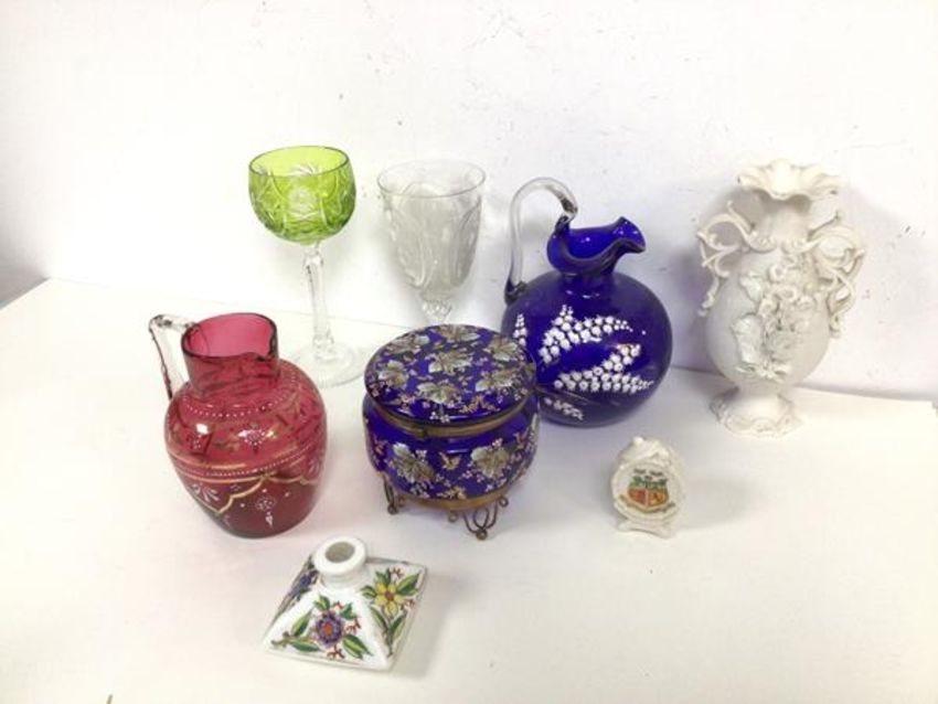 A mixed lot including a blue glass lidded jar with foliate enamels and gilt decoration, a cranberry glass water jug, a blue glass jug, a biscuit pottery vase, a hock glass (8)