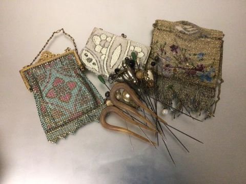Three various lady's beaded and metalwork evening purses and a collection of vintage hair pins and combs (a lot)
