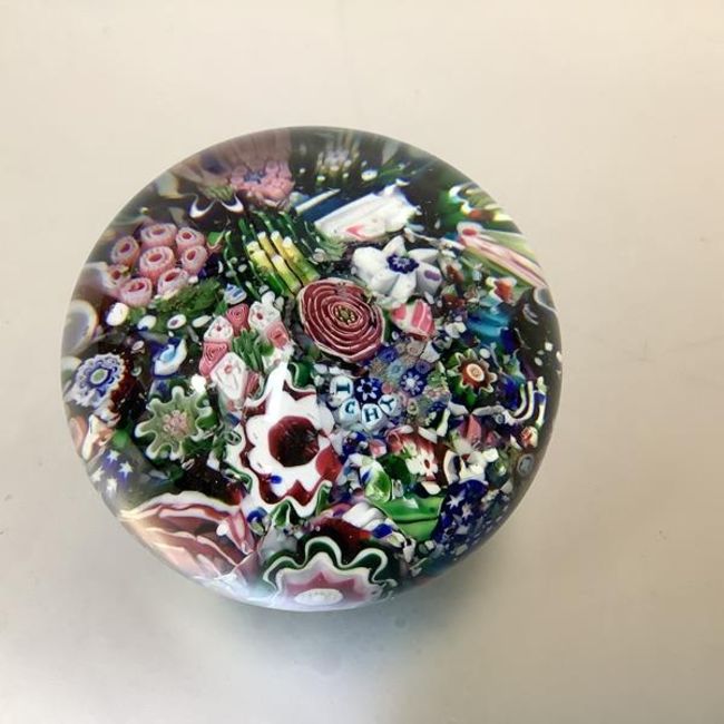 A French 19th century scrambled millefiori glass paperweight, probably Clichy, the canes incorporating a pink rose and the letters "I C H Y". Diameter 6cm