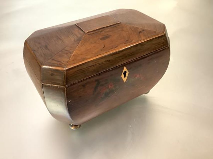 A 19th century mahogany tea caddy, of bombe sarcophagus form, with unusual painted decoration of rose swags to the front and sides, on gilt-metal ball feet, with later fabric-padded interior. 15cm by 21cm by 13cm