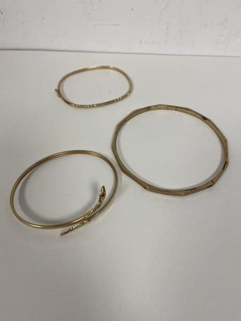 A 9ct gold bangle with Greek key decoration to exterior measures 7.5cm diameter along with another 9ct gold bangle with clasp which measures 5x6cm, combined weight of 9 grammes. Another yellow metal bangle in the form of a snake.