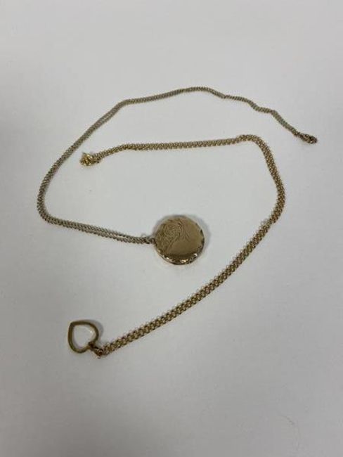 A 9ct gold belcher chain with gilt metal heart pendant measures 25cm and another chain marked 9ct with yellow metal locket, combined weight 8.82 grammes