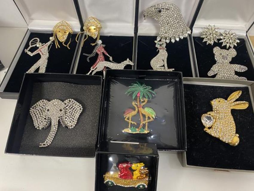 A collection of Butler & Wilson costume jewellery including brooches such as lady walking dog, tennis player, cat, elephant also two pairs of earrings (a lot)