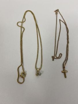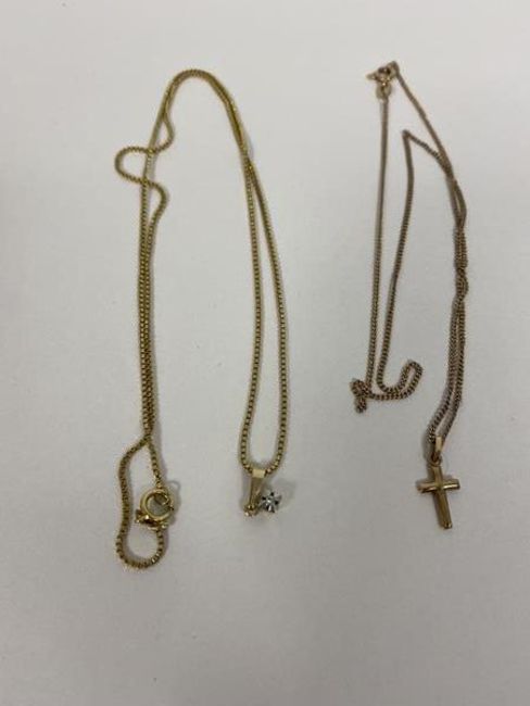 A gold chain necklace marked .333 along with 14ct gold pendant with small clear stone measures 25cm and another chain marked .333 with crucifix pendant possibly marked 17c, combined weight 5.33 grammes