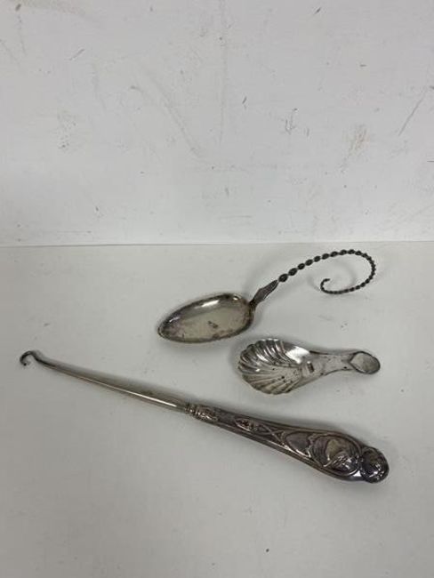 An Edwardian Chester silver caddy spoon with shell shaped bowl, button hook with London silver handle and spoon with spiral turned handle marked 830