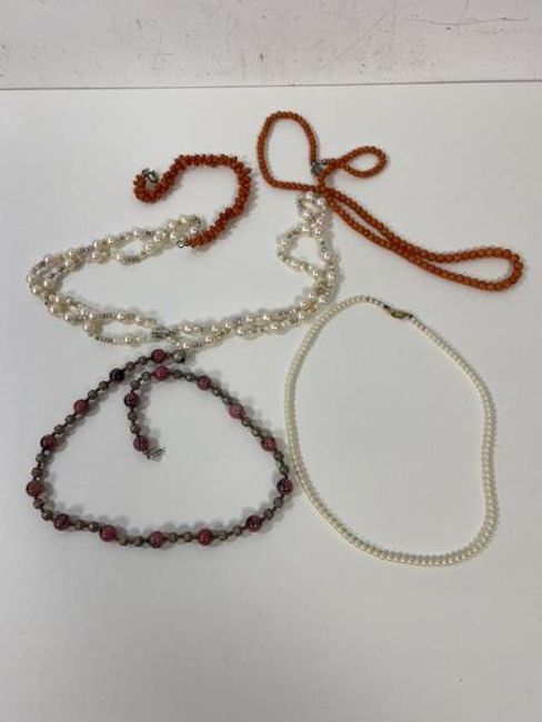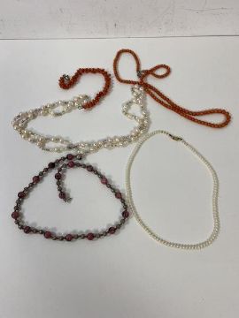 A pearl necklace with clasp marked 750, measures 19cm, another strand of pearls with silver clasp, coral necklace and bracelet, and coloured stone necklace with white metal beads (5)