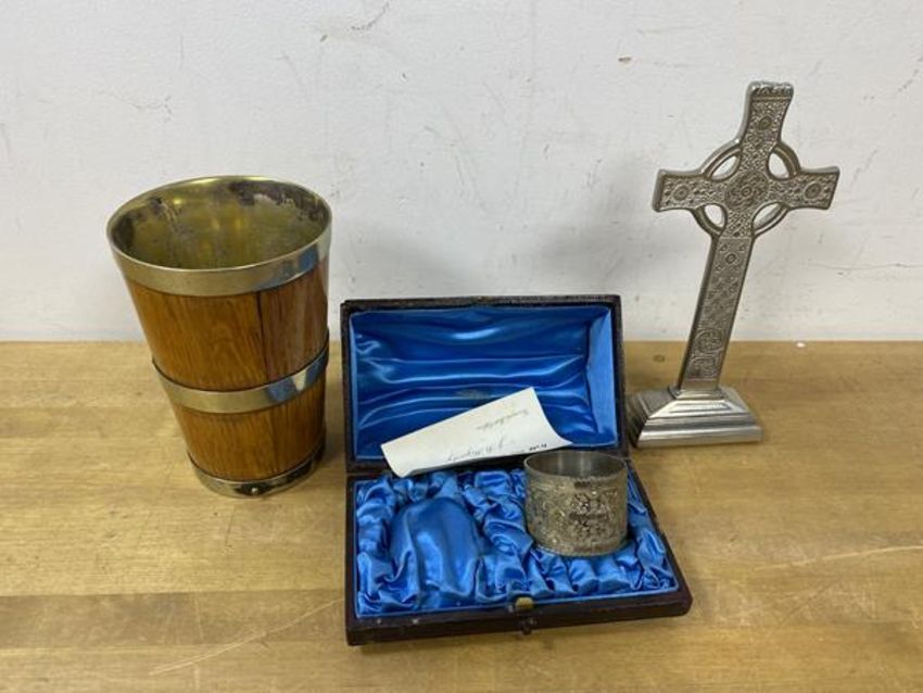 A Sheffield silver napkin ring with original case, lacking other ring, a metal bound and interior wooden drinking cup and a table cross ornament, 17cm high