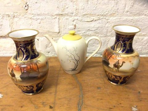 A pair of Noritake baluster shaped vases both depicting Egyptian scenes, measure 21cm high, and a 1930's coffee pot (3)