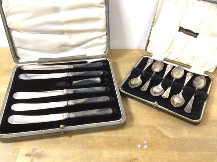 A set of six 1935 Sheffield silver coffee spoons, in original case, with combined weight 51 grammes, and a set of five mother of pearl handled butter knives with silver collars (a lot)