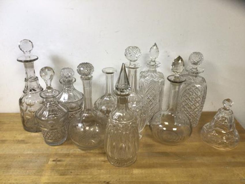 A group of decanters of various ages, sizes and designs, tallest measures 25cm high