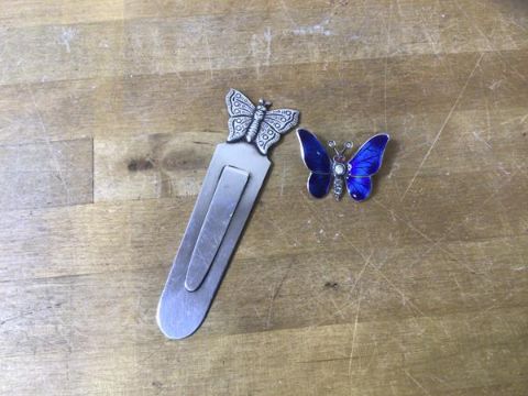 A Birmingham silver bookmark with butterfly finial, measures 8cm high, along with an enamel and silver brooch in the form of a butterfly, marked 925 (2)