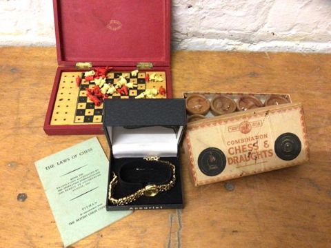A mixed lot including an Accurist ladies wrist watch, strap a/f, a travelling chess set and a combination chess and draughts pieces, (a lot)