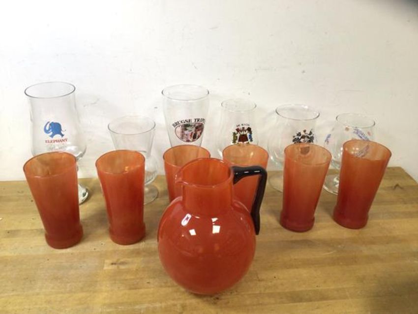 A set of six red grapefruit coloured tall glasses, each measures 14cm high, with matching pitcher, along with a collection of six different branded beer glasses (a lot)