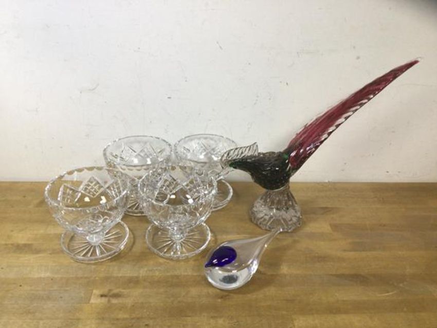 A mixed group of glass including a Murano style exotic bird with exaggerated tail feather, measures 25cm high, an ornament or paperweight in the form of a nesting bird and four footed glass bowls (a lot)