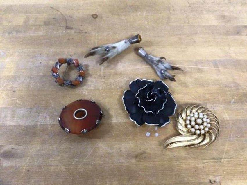 A mixed lot of costume jewellery including a two circular polished stone brooches, two birds feet, flower and spinning sun with faux pearls (6)
