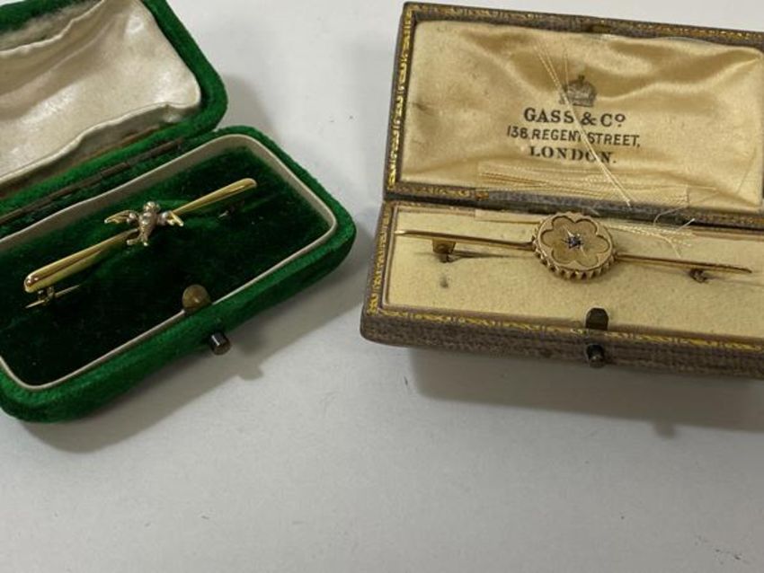 A gold bar brooch with bird having five seed pearls (4cm) weighs 1.26 grammes, a yellow metal bar brooch with circular plaque with central stone (2)