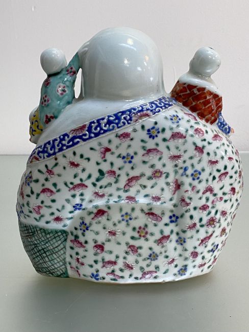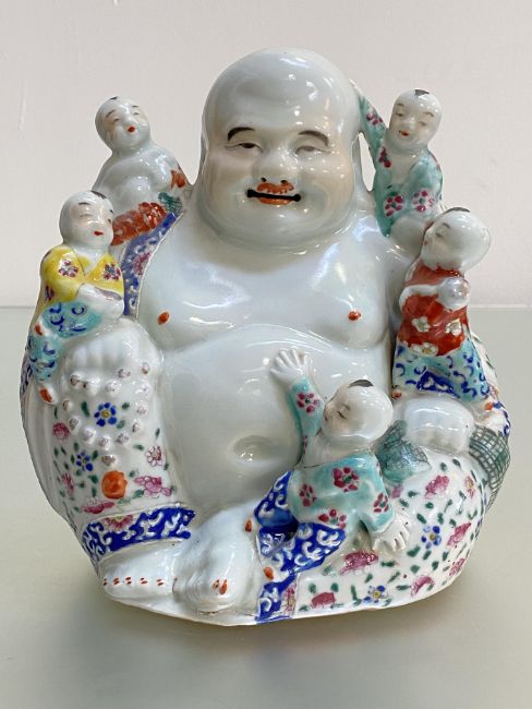 A Chinese famille rose porcelain group of a laughing Buddha with five children, the unglazed base with impressed mark. Height 20.5cm
