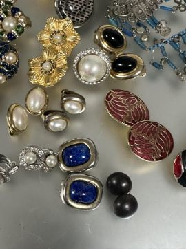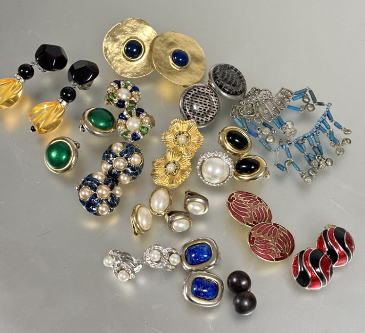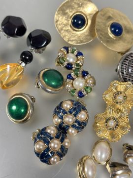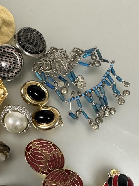 Property of the late Countess Haig: A collection of clip on Vintage 80's style earrings including perspex black and amber drop earrings, hammered yellow metal blue cabochon earrings etc. (A lot)