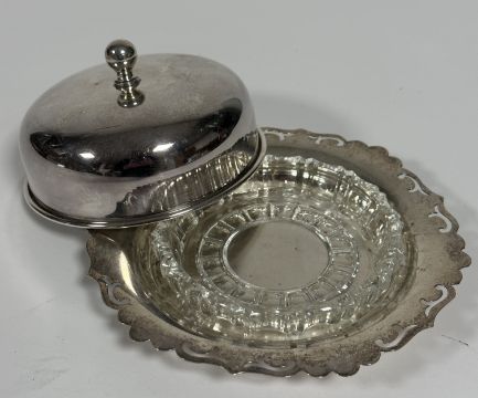 An Epns dome top butter dish with glass liner and pierced stand, (h x 6.5 cm x D x 13 cm)