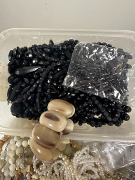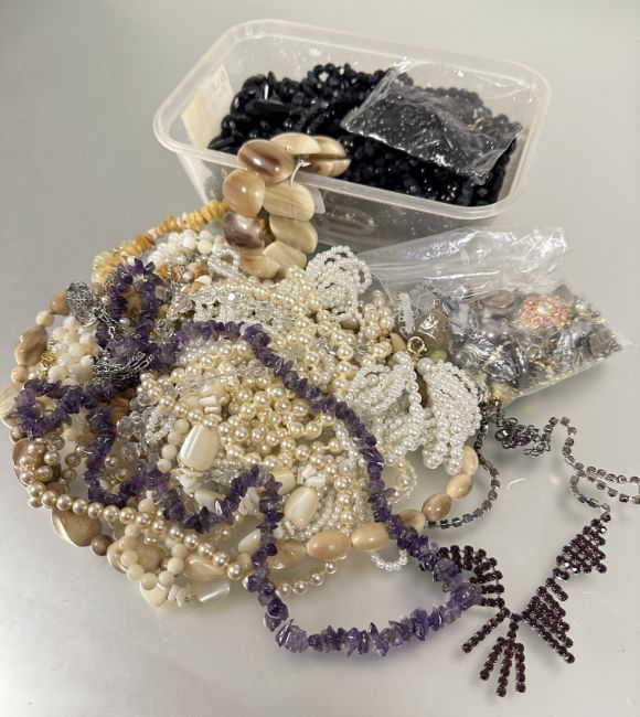 A horn graduated bead necklace, ( L x 22 cm), horn panel bracelet, and a collection of paste pearl necklaces's, a collection of clasp fastenings and a large collection of French jet beads. (A lot)