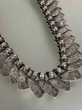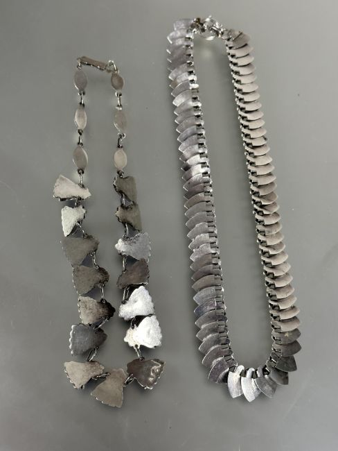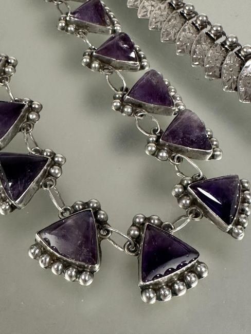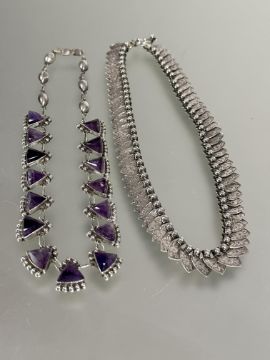A white metal lotus leaf engraved frond style necklace with beaded top articulated links, ( L x 18 cm) and a white metal triangular necklace set fifteen amethyst beaded frame panels with three oval bead links, ( L x 20 cm) (2)