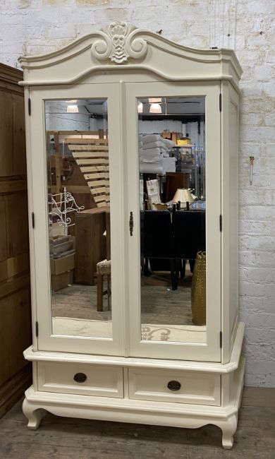 A French style cream painted armoire, the two mirrored doors enclosing an interior with slides and hanging rails, above two drawers to base, raised on cabriole supports. H220cm, W166cm, D62cm.