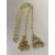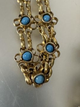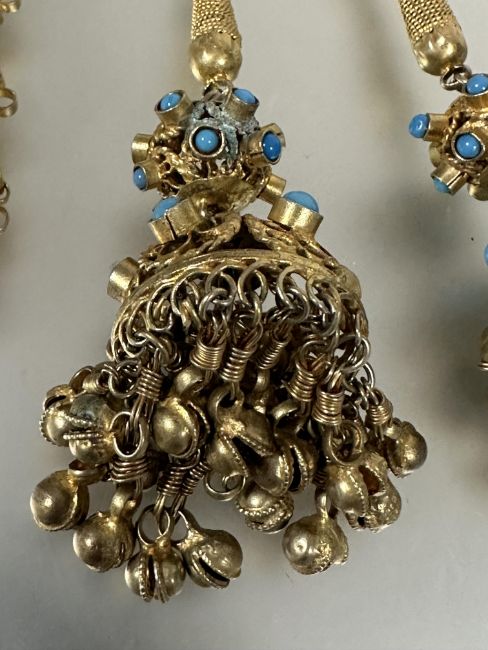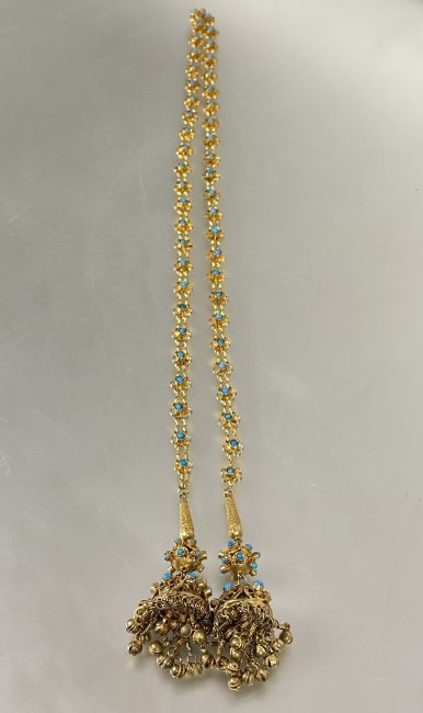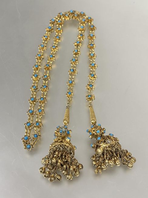 A Indian style gilt metal floral chain link open tassel necklace with inset turquoise ceramic beads and bell tipped ends. (L x 56 cm)