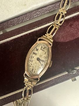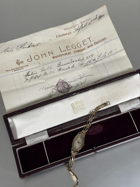 A Lady's 1900 Vintage 9ct gold oval shaped Swiss wristwatch with silver engine turned dial and Arabic numerals on rolled gold bracelet, working,  complete with original purchase receipt for £4 - 10 shillings from John Legget Edinburgh (L x 3.5 x W x 1.6 cm). 13g