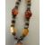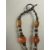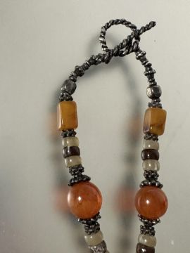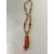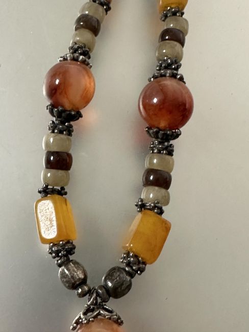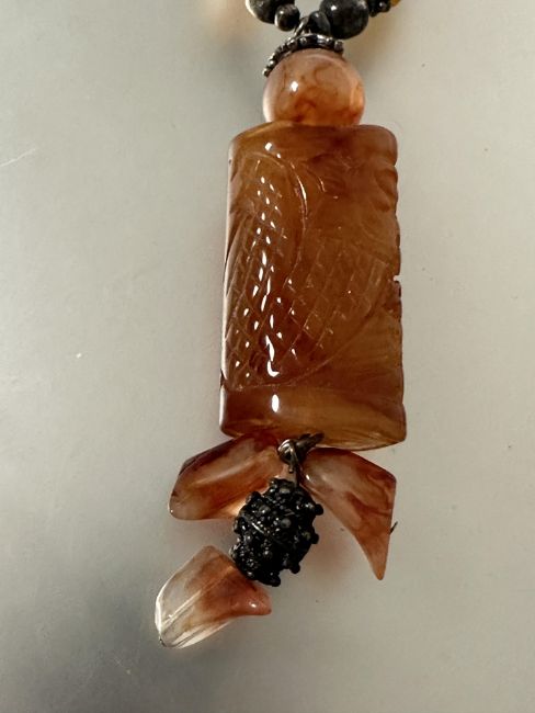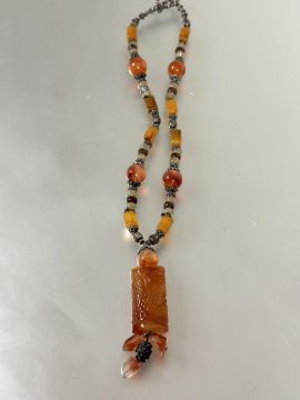 A white metal beaded carnellian bead necklace with rectangular oval panel with relief carved leaves with three carnellian bed drop , ( L x 29 cm)