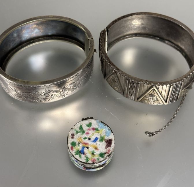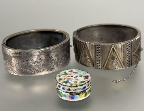 A silver Edwardian stiff hinged bangle with engraved floral panels and safety chain, (H x 2.5 cm x D 6 cm) a Edwardian stiff hinged white metal bangle with floral and leaf engraved design, (H x 2.5 cm x D x 5.5 cm) and a Chinese enamel circular pill box, losses to enamel and hinge. ( D x 3 cm) (3) 63g