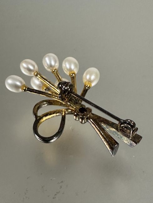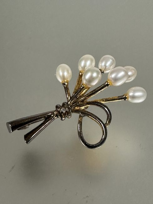 Property of the late Countess Haig: A gilt metal spray brooch set seven oval cultured pearls and a diamond to central stem, unmarked, (H x 4 cm)