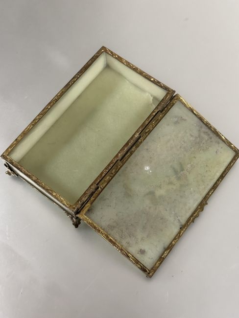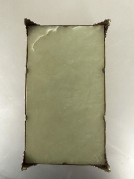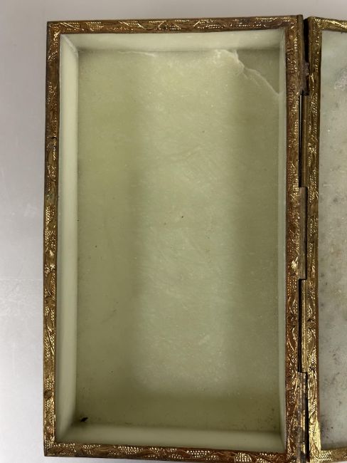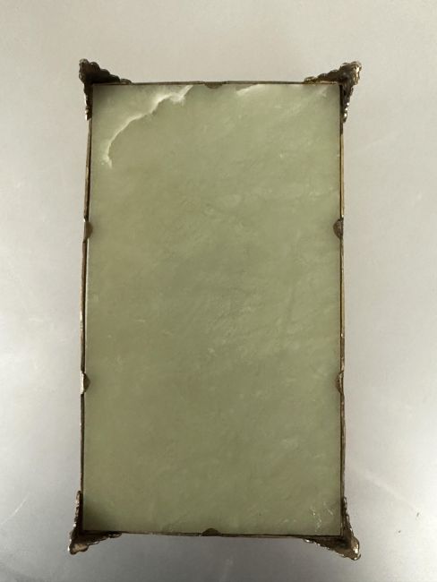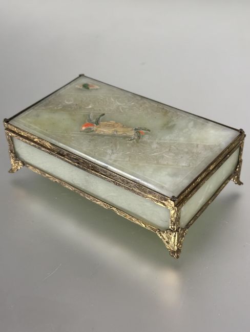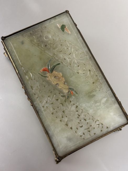 A Celladon jadeite rectangular box the top with pieced relief carved floral diagonal panels with inset coral and jade flowers and leaves moutned in gilt metal and raised on bracket leaf supports, shows no signs  of damage, ( H x 5 cm x L x 15 cm x W x 8.5 cm)