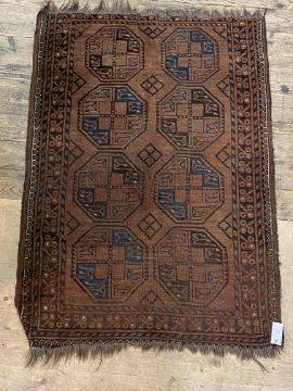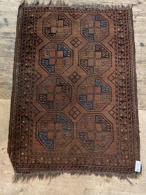 An antique  Turkmen baluch rug of typical design and bordered 203cm x 110cm.