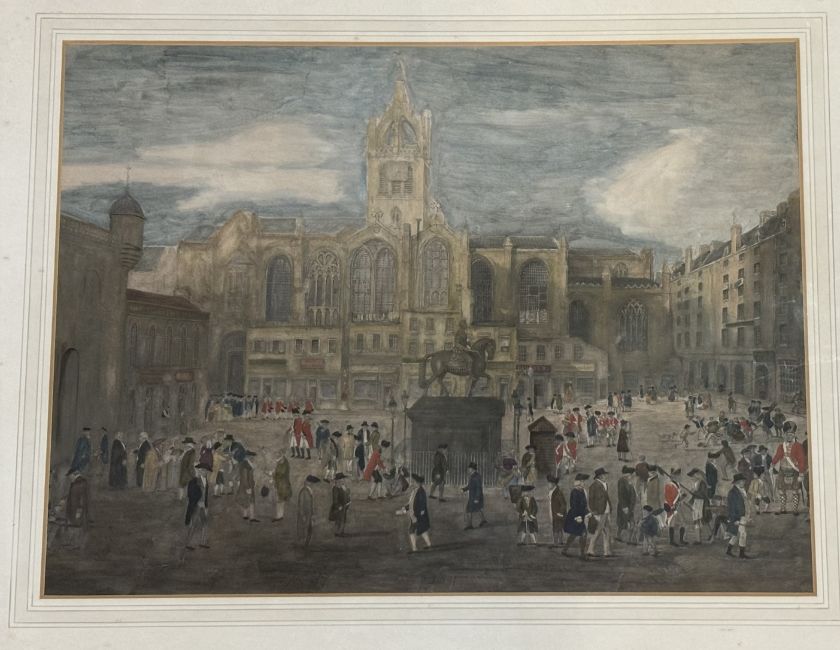 Unknown artist, a coloured 18thc British square bookplate, watercolour and pencil, unsigned, framed. (tears to paper) (41cmx55cm)