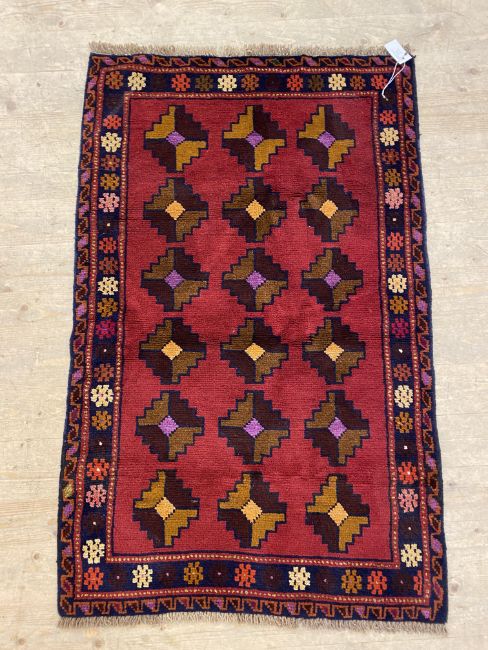 A hand knotted Baluchi rug of all over geometric design. 130cm x 83cm.