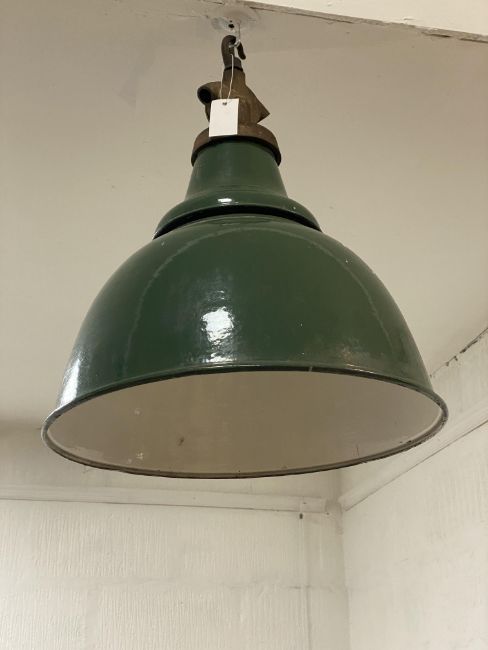 A large industrial green and white enamel pendent light, early to mid 20th century. H55cm.