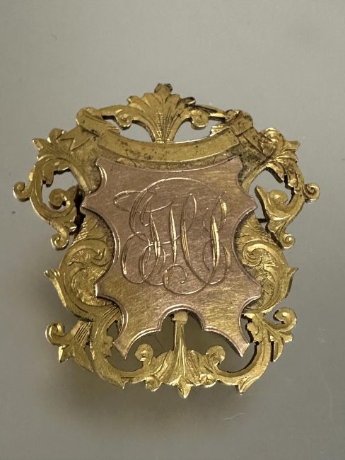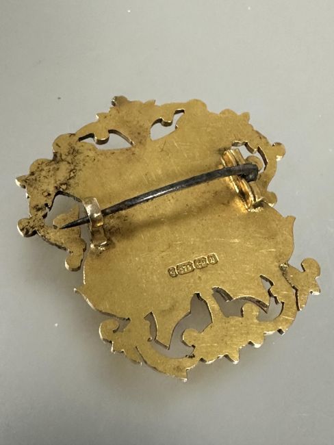 A 9ct two coloured gold crest brooch with engraved initials JHB  no signs of hard solder or repairs H x 3.5cm W x 4cm 12.8g