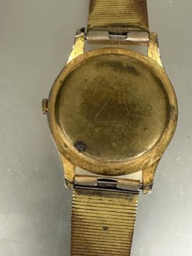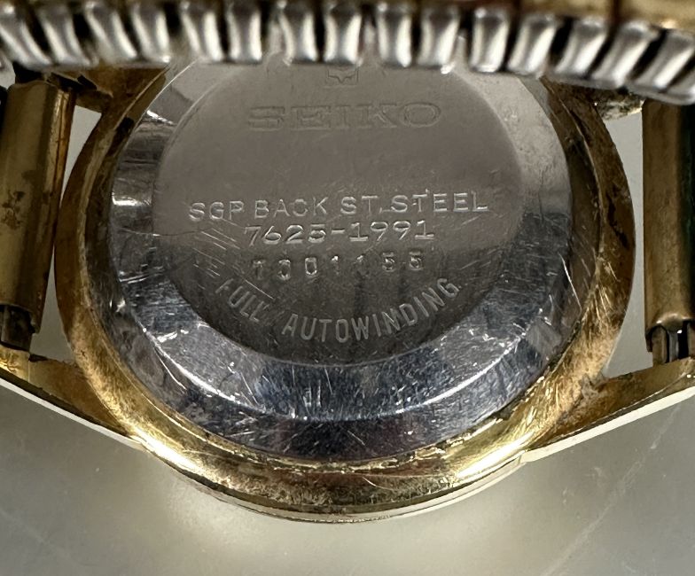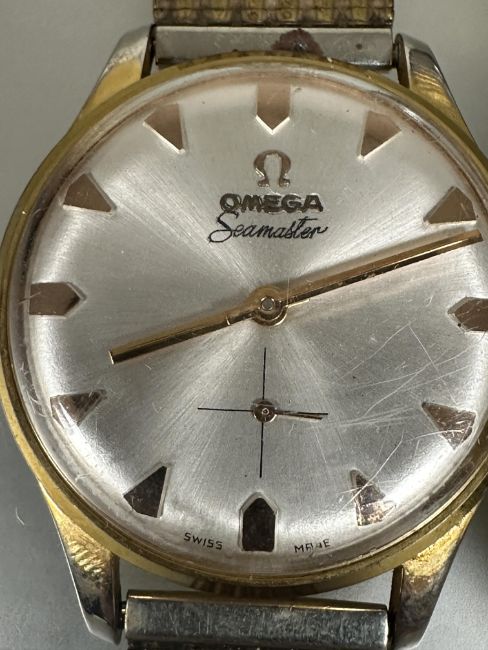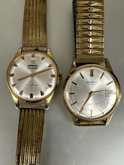 Vintage gents gilt metal Omega automatic Seamaster style watch with silvered dial and dart shaped hour markers and subsidiaries dial complication working on milanese style bracelet D x 3.5cm  and a Seiko gilt metal gents automatic wrist watch missing winder on expanding bracelet (2)